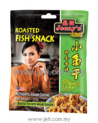 | Description: Our Jeeny's Roasted Fish with Wasabi Flavour is a premium seafood snack. They are hygeniecally processed under internationally approved food standards (HACCP, GMP, EU and Halal) and ready to eat with beers. |